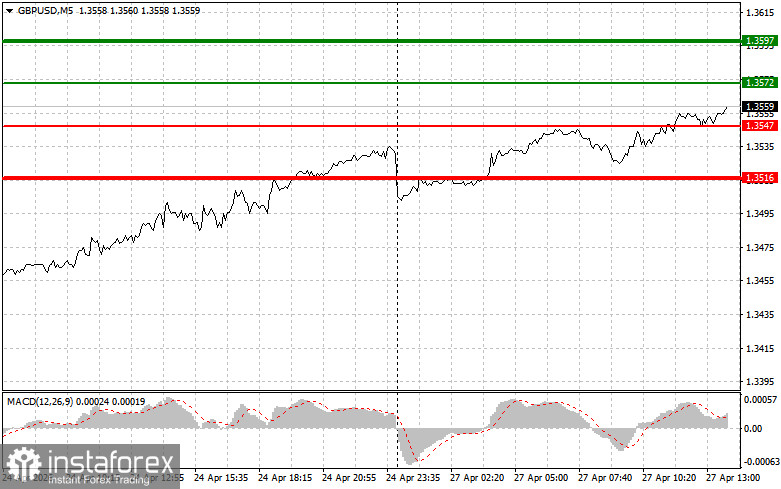 Scenario No. 2: I also plan to buy the pound if there are two consecutive tests of the 1.3547 level while the MACD indicator is in the oversold zone. This will limit the pair's downward potential and trigger an upward reversal. A move toward 1.3572 and 1.3597 can be expected.