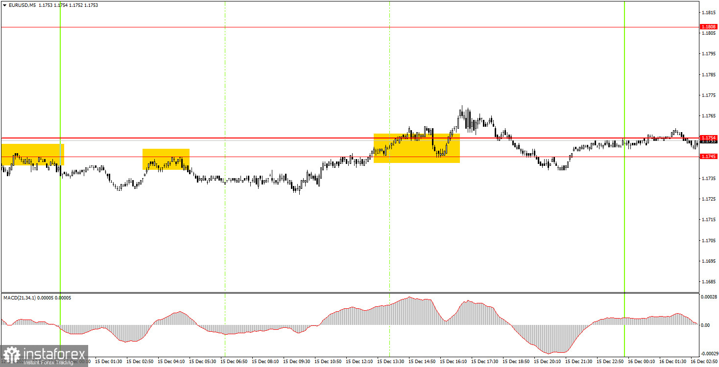 На 5-минутном ТФ в понедельник было сформировано два торговых сигнала, но движения опять были слабыми, поэтому отрабатывать их не было никакого смысла. Первый сигнал сформировался ночью, второй сигнал – на американской торговой сессии, когда уже было ясно, что никаких интересных движений мы не увидим. Сегодня же сигналы могут продолжать формироваться в области 1,1745-1,1754, но в течение дня на фоне макроэкономических публикаций трейдеры могут увидеть резкие, нетехнические развороты цены.