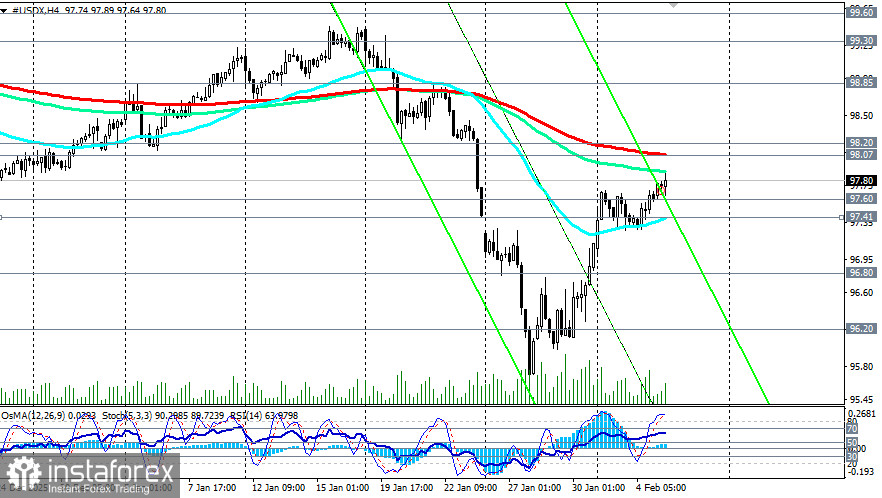 С технической точки зрения, со вчерашним пробоем краткосрочного уровня сопротивления 97.34 (ЕМА200 на 1-часовом графике на тот момент), индекс доллара USDX переместился в зону краткосрочного бычьего рынка, продолжая развивать восходящую коррекцию, двигаясь в сторону зоны сильного сопротивления - важного краткосрочного 98.07 (ЕМА200 на 4-часовом графике), 98.32 (верхняя линия нисходящего канала и ЕМА50 на дневном графике).