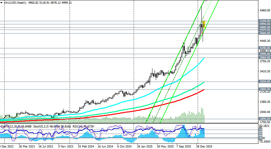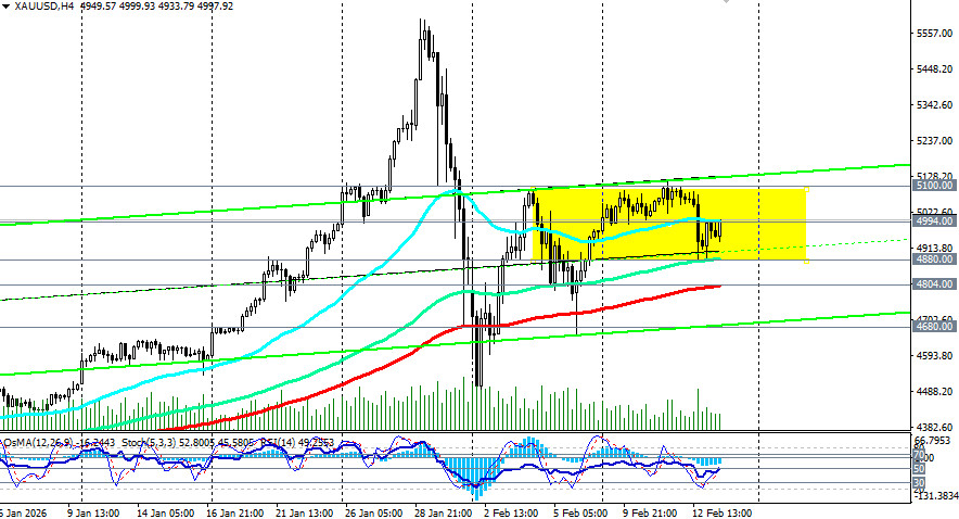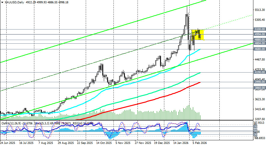 Пара же XAU/USD, несмотря на вчерашнюю вечернюю коррекцию, сохраняет позитивную динамику. Для ее усиления, с технической точки зрения, цене необходимо преодолеть зону сопротивления 4994.00 – 5000.00 и пробить верхнюю границу недавно установившегося недельного диапазона 4880.00 – 5100.00, где зона 4994.00 - 5000.00 выступает, своего рода, срединной зоной.