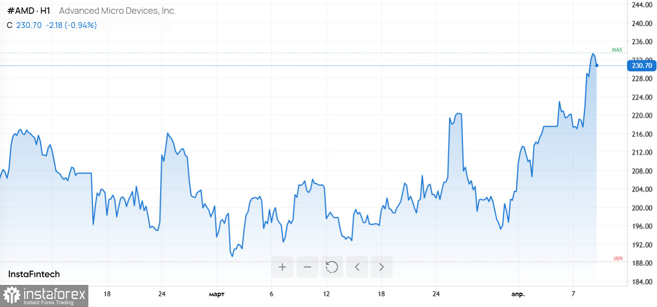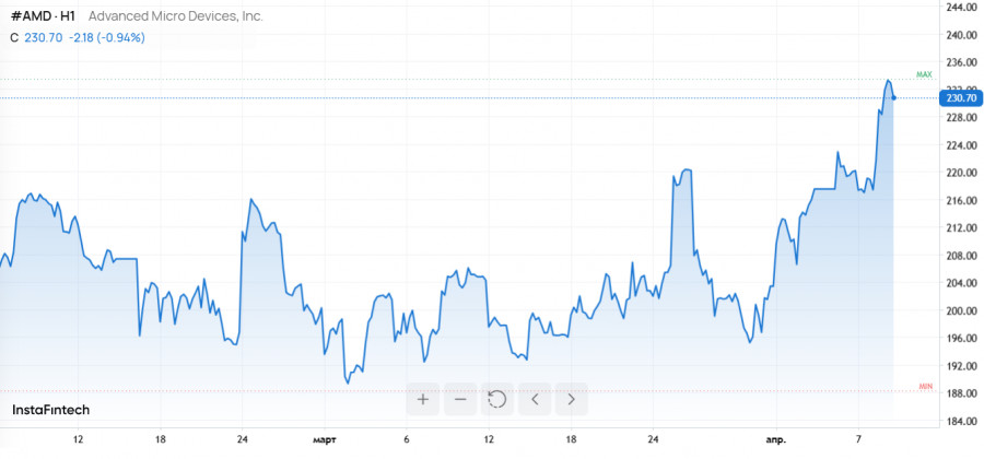 8 апреля бумаги AMD открылись выше отметки $232 против закрытия около $220 днём ранее. Движение рынка стало реакцией на серию аналитических обзоров, которые публиковались на протяжении предыдущей недели. В этих материалах инвесторам рисовали более позитивную картину для производителя чипов в преддверии отчета за 1 квартал, который ожидается примерно 5 мая.