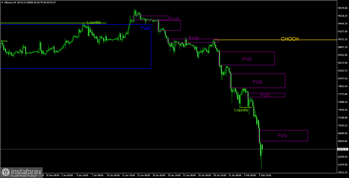 На дневном ТФ биткоин продолжает формирование нисходящей тенденции. Структура тренда идентифицируется, как нисходящая, а линия CHOCH в данное время проходит на уровне 97 900$. Только выше этого уровня можно будет считать, что нисходящий тренд завершен. «В 2026 году биткоин может падать хоть до 60 000$». Так мы говорили ранее. А теперь биткоину до уровня 60 000$ остается всего ничего. Только за вчерашний день BTC стал дешевле на 10 000$. Цена получила красноречивую реакцию на «медвежий» FVG(96 900$ – 98 000$), торговый сигнал был сформирован. С тех пор «биток» потерял уже 30 000$. Следующей целью падения выступает уровень 57 500$ – 61,8% по Фибоначчи. Областей POI сейчас целых три, а в ближайшее время могут сформироваться новые. Но какой в них смысл, если биткоин не корректируется?