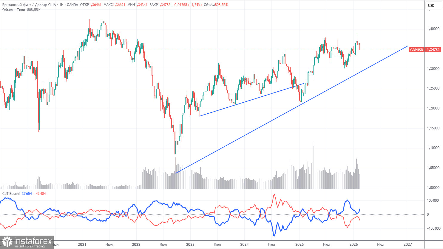 Доллар продолжает снижаться из-за политики Дональда Трампа, что отлично видно на недельном ТФ(иллюстрация выше). Торговая война будет продолжаться в том или ином виде еще долгое время, а ФРС в любом случае будет снижать ставку в ближайшие 12 месяцев. Спрос на доллар так или иначе будет падать. Согласно последнему отчету COT(от 17 февраля) по британскому фунту, группа «Non-commercial» закрыла 6,4 тысячи контрактов BUY и открыла 10,2 тысячи контрактов SELL. Таким образом, нетто-позиция некоммерческих трейдеров уменьшилась за неделю на 16,6 тысячи контрактов.