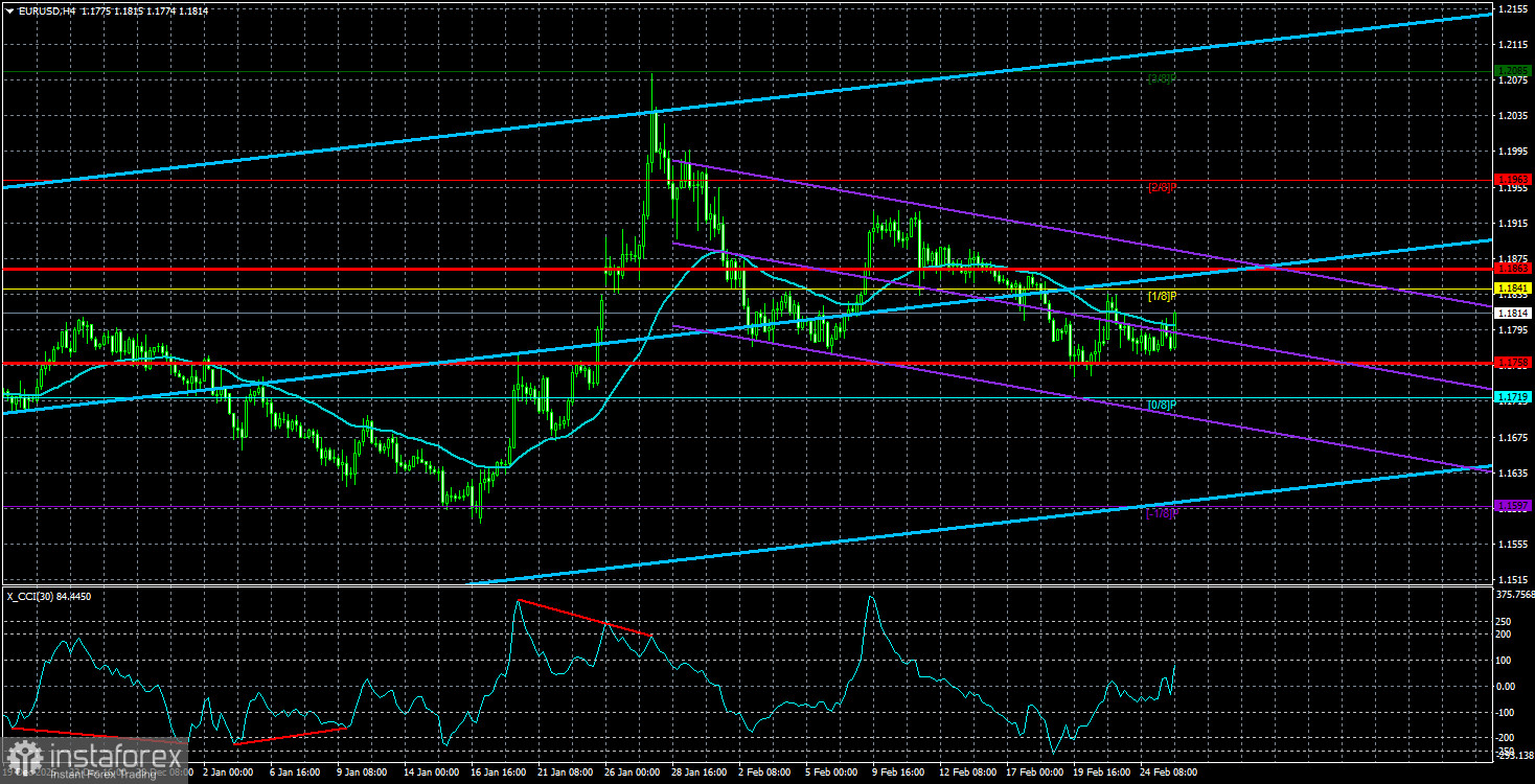 Средняя волатильность валютной пары EUR/USD за последние 5 торговых дней по состоянию на 26 февраля составляет 53 пункта и характеризуется, как «средняя». Мы ожидаем движение пары между уровнями 1,1758 и 1,1863 в четверг. Старший канал линейной регрессии направлен вверх, что указывает на дальнейший рост евровалюты. Индикатор CCI заходил в область перепроданности, что предупреждает о возобновлении восходящего тренда.