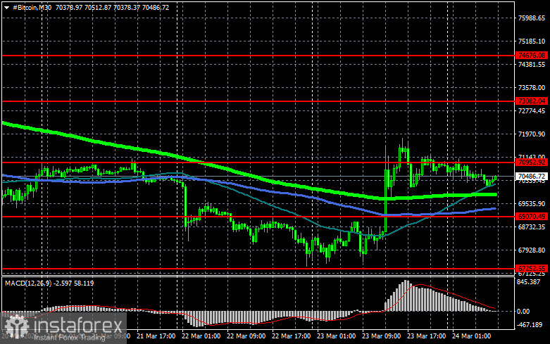 Что касается технической картины Bitcoin, то покупатели сейчас нацелены на возврат уровня $70 900, который открывает прямую дорогу на $73 000, а там уже и рукой подать до уровня 74 600. Самой дальней целью выступит максимум в районе $76 500, преодоление которого будет означать попытки возврата бычьего рынка. В случае падения биткоина покупателей жду на уровне $69 000. Возврат торгового инструмента под эту область может быстро свалить BTC в район $67 200. Самой дальней целью будет область $64 900.